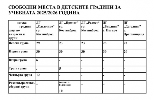 Ето и свободните места в детските градини за учебната 2026/2027 година: