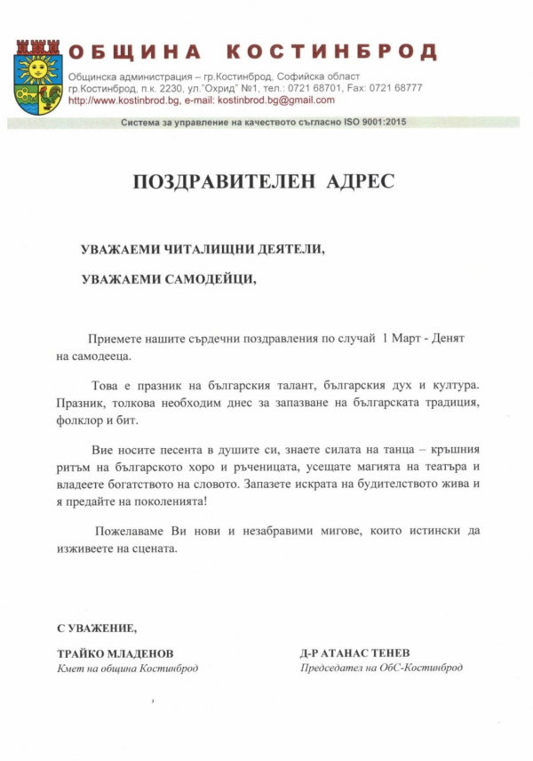 Поздравителен адрес от кмета на община Костинброд и Председателят на Общински съвет до всички читалищни дейци и самодейци бе публикуван на официалния сайт на Общината