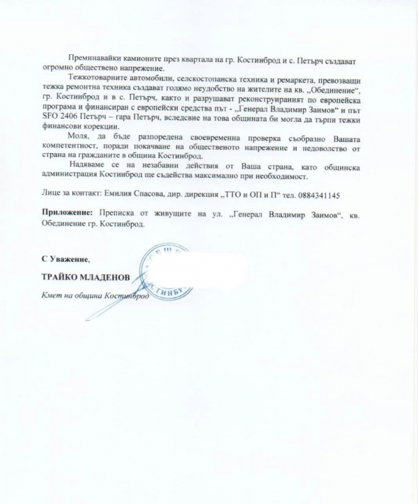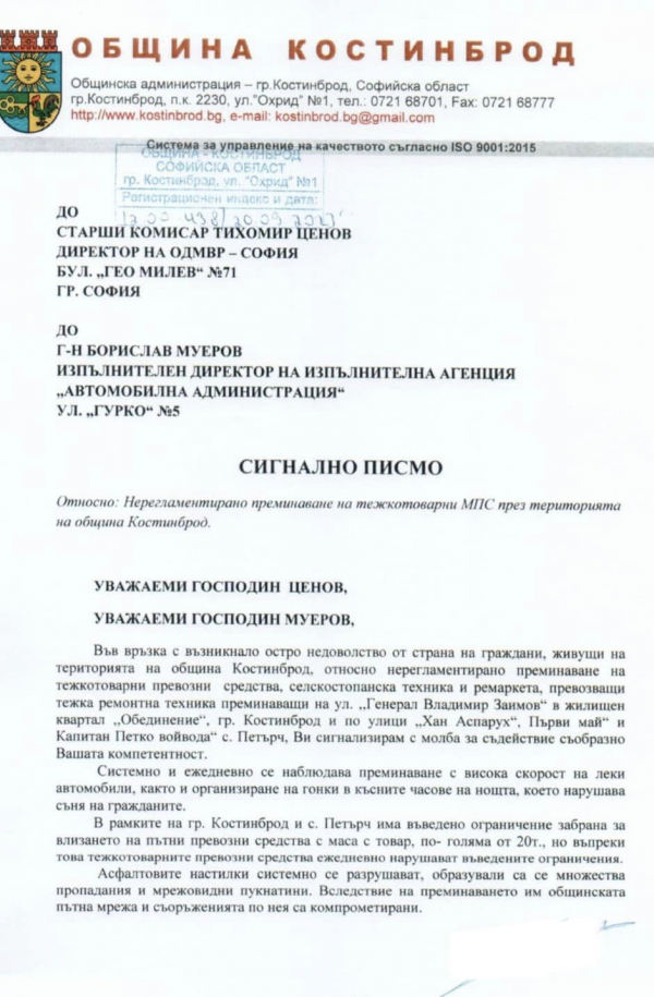 Във връзка с възникнало остро недоволство от страна на граждани, живущи на територията на община Костинброд, относно нерегламентирано преминаване на тежкотоварни превозни средства, селскостопанска техника и ремаркета, ръководството на общината сигнализира ОДМВР - София и Изпълнителна агенция „Автомобилна администрация“.