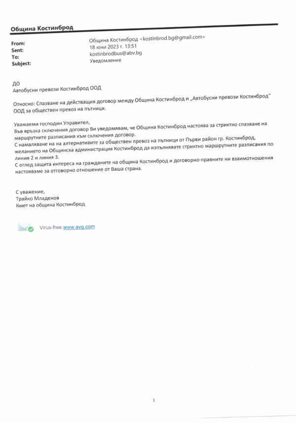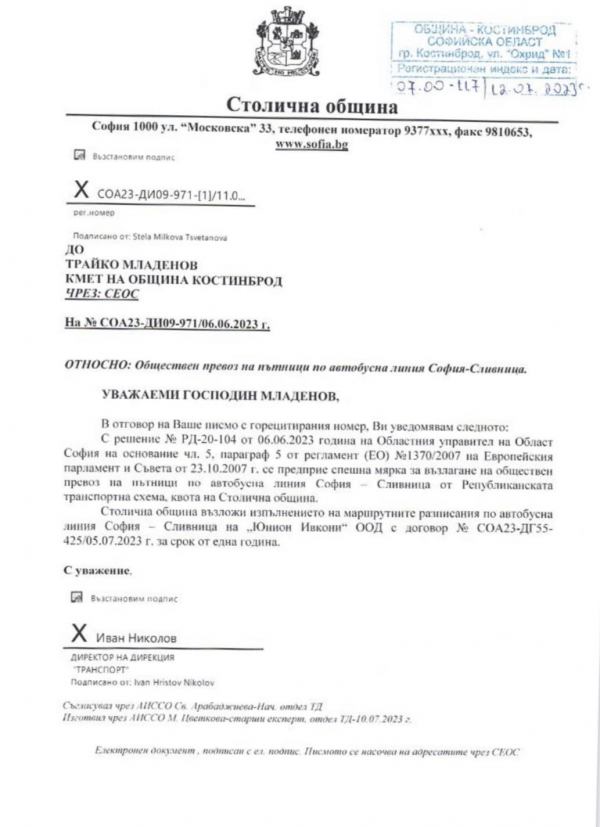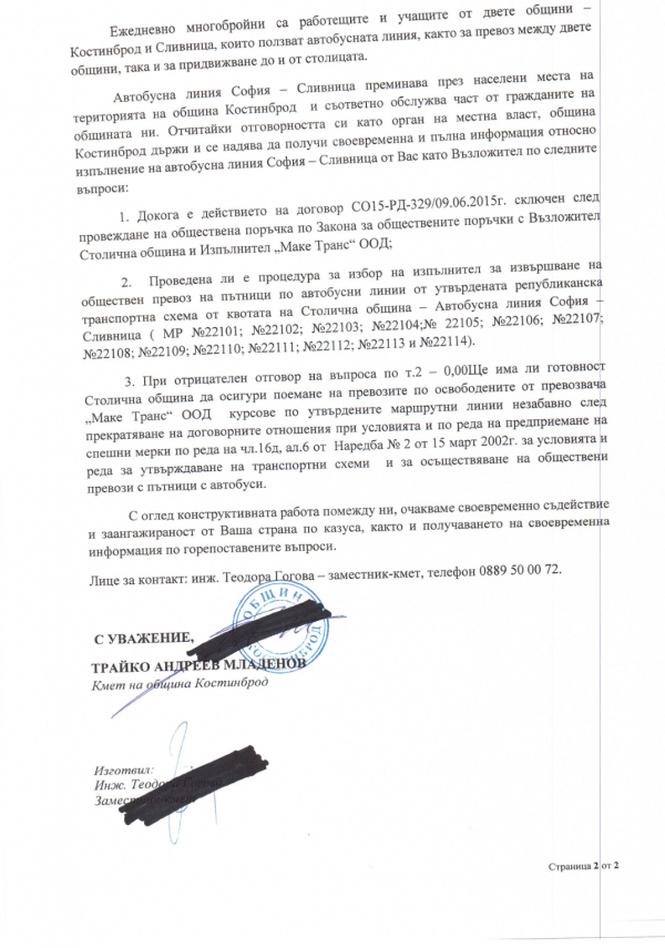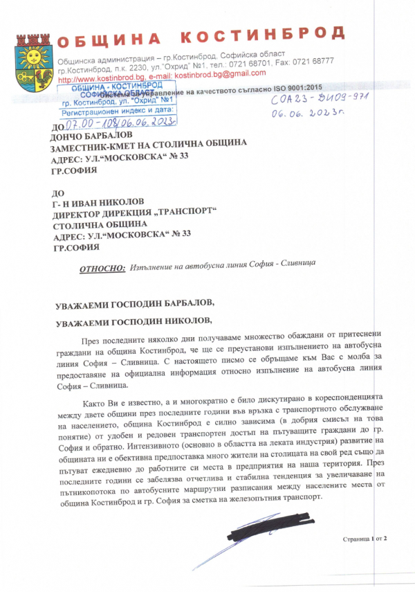 Поради факта, че Община Костинброд не е страна по договорно-правните отношения между Столицата и съответния превозвач,  изисквахме незабавно да ни бъде предоставена информация по случая още на 6 юни 2023г., с писмо с изх. Номер 07.00-108/06.06.2023г.