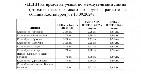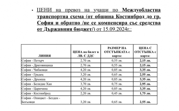 Учениците в дневна форма на обучение и студентите редовно обучение, включително докторантите в редовна форма на обучение, учащи в училищата, висшите училища и научните организации, включени в Регистъра на средните училища и детските градини и в Регистъра на акредитираните висши училища на Министерството на образованието и науката, пътуващи от община Костинброд до гр.София и обратно (Междуобластна транспортна схема /не се компенсира със средства от Държавния бюджет/) ще продължат да ползват 20% намаление от цената на билета (предоставена от „Общински превози-Костинброд“ ЕООД).“