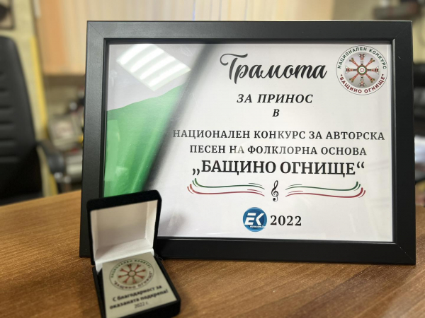 Община Костинброд, получи плакет и грамота за принос от Ивайло Шопски – организатор Националния конкурс за авторска песен на фолклорна основа „Бащино огнище“.