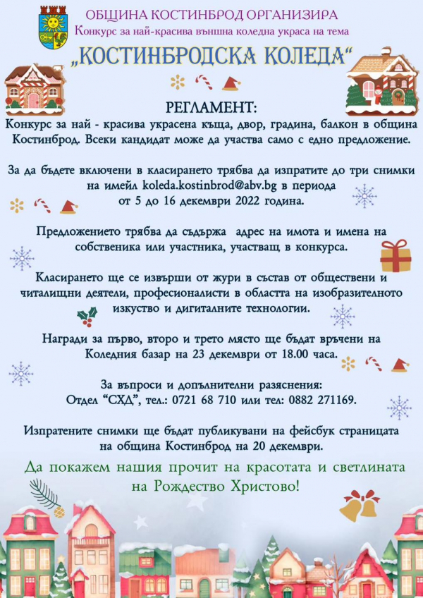 Община Костинброд ще провокира въображението на своите жители с конкурс за външна коледна украса, на тема „Костинбродска Коледа“. Инициативата е посветена на предстоящите коледни и новогодишни празници.