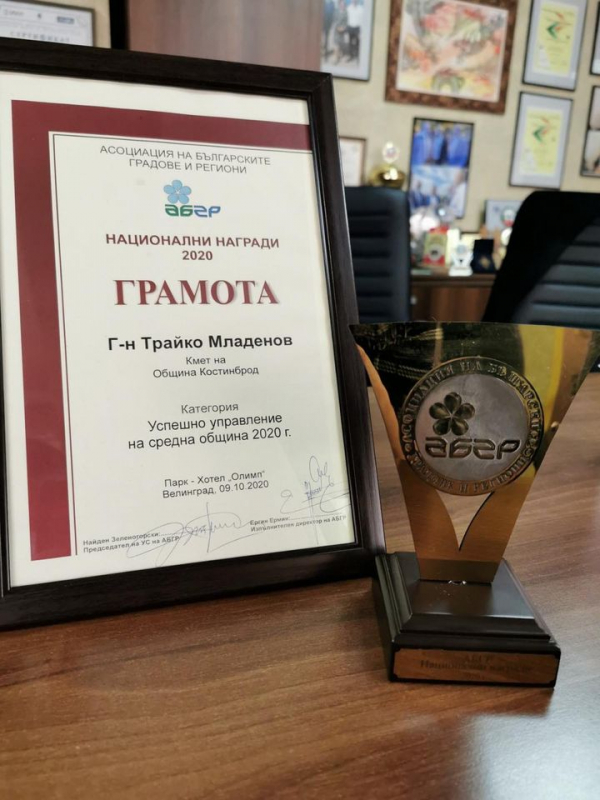 Награда на „Асоциация на българските градове и региони“ (АБГР), за 2020 г., в категория „Успешно управление на средна община 2020 г.” получи кметът на община Костинброд Трайко Младенов.