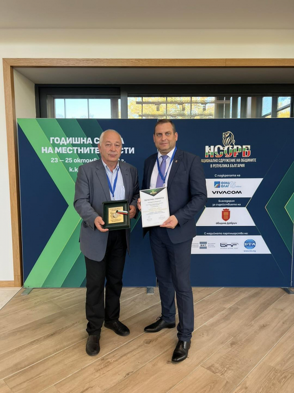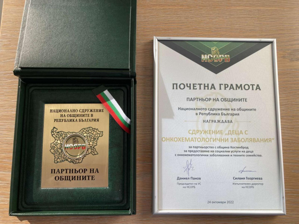 Пламен Белчев – управител на Сдружение „Деца с онкохематологични заболявания“ прие приза от Калин Каменов – член на УС на НСОРБ и кмет на община Враца. Наградата е в категория „Партньор на общините“ за изграждане и развитие на първия в България и на Балканите възстановителен център за деца с онкохематологични заболявания.