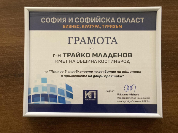 Община Костинброд с престижна награда „Принос в управлението за развитие на общината и прилагането на добри практики“. Награждаването се проведе по случай излизане на справочник София и Софийска област - Бизнес, култура, туризъм 2023 г.