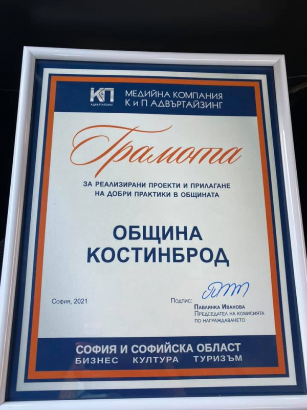 Община Костинброд, в лицето на кмета - Трайко Младенов, получи престижна награда в категория “Реализирани проекти и прилагане на добри практики” за положени усилия за успешно реализирани проекти през 2020 г., по време на тържествена церемония в Балната зала на Национална галерия - Довреца, гр. София.