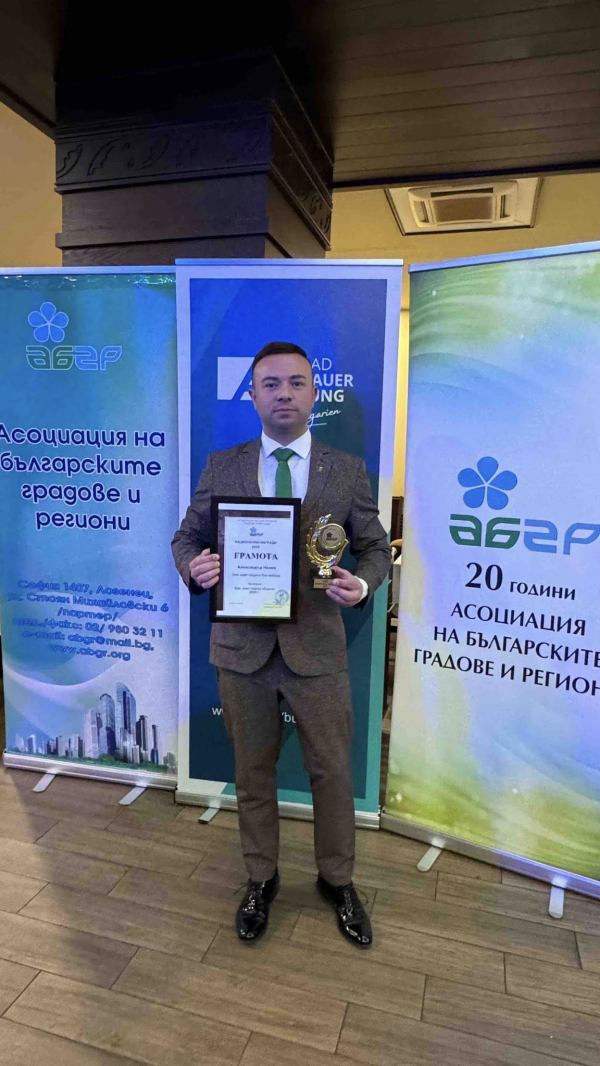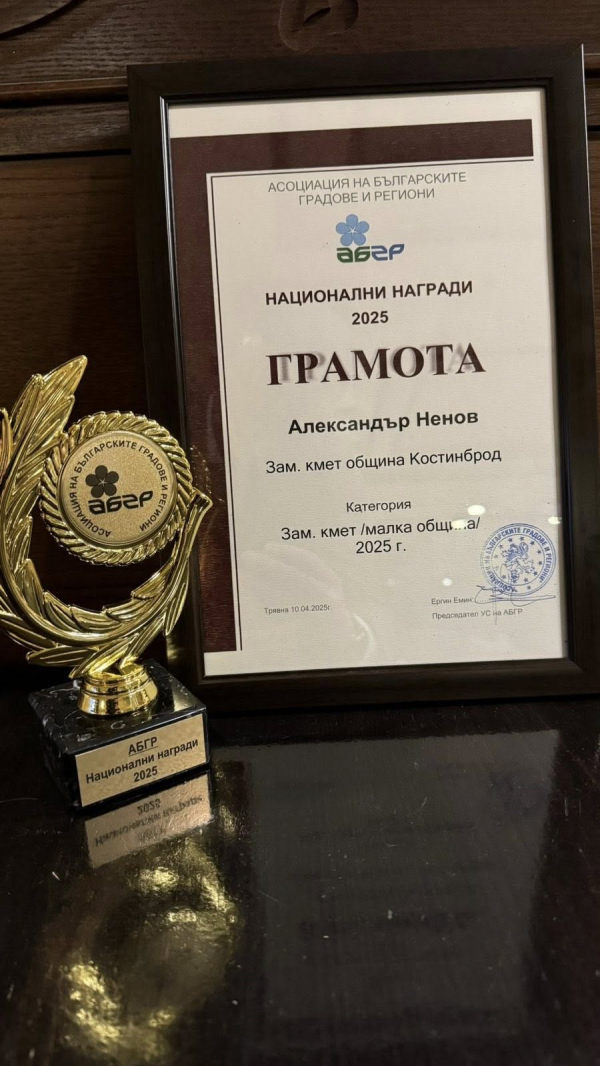 На Националния зелен форум, който се проведе на 10 и 11 април в Трявна, заместник-кметът на община Костинброд – Александър Ненов, получи престижната награда в категорията „Заместник-кмет в малка община - 2025“. Призът му беше връчен от Ректора на Университета за национално и световно стопанство (УНСС) – проф. д-р Димитър Димитров, по време на събитието, организирано от Асоциацията на българските градове и региони (АБГР).