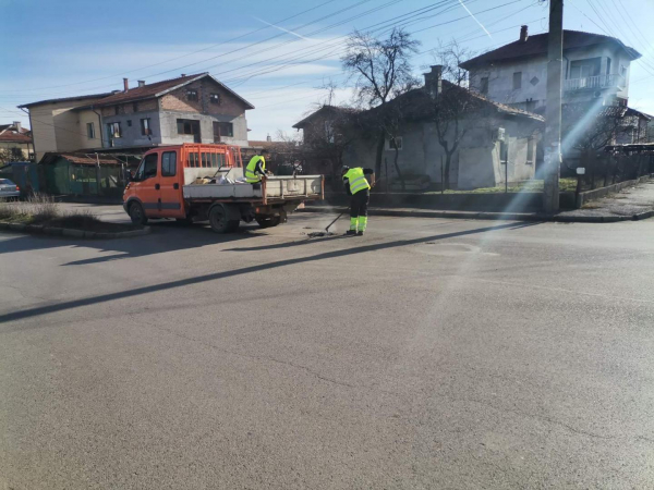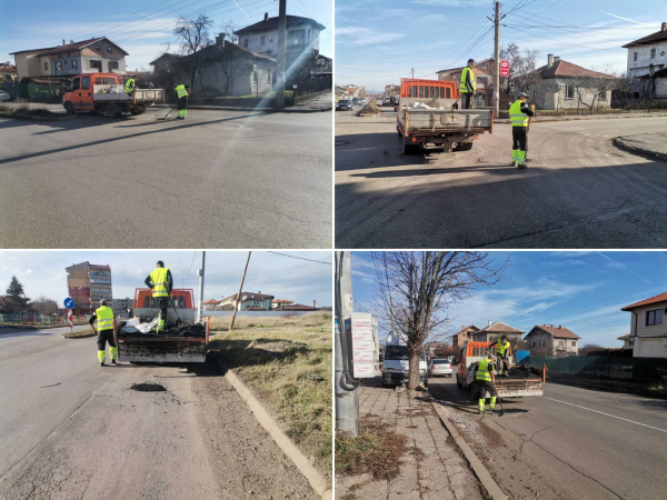 Община Костинброд тампонира спешно с асфалтова смес появилите се дълбоки дупки по главни улици на град Костинброд.