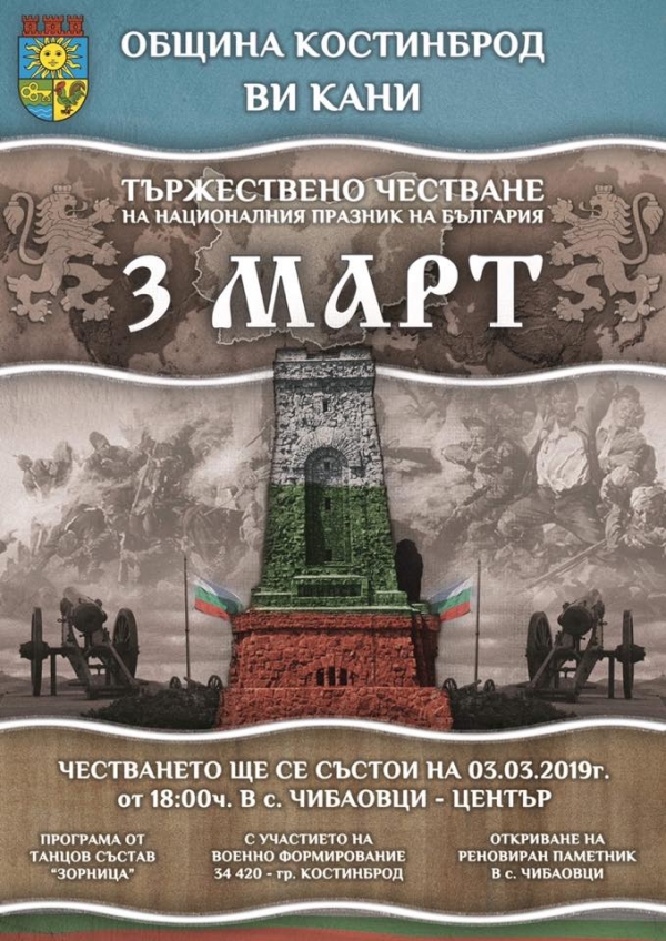 Село Чибаовци ще бъде център на честванията по повод Трети март в община Костинброд. Националният празник ще бъде отбелязан с програма, която ще изнесе танцов състав „Зорница“. В празника по традиция ще се включат и части от военно формирование 34 420 – Костинброд.