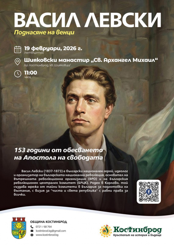 С възпоменателна церемония и поднасяне на венци и цветя на 19 февруари 2026 г. община Костинброд ще почете живота и делото на Васил Левски – Апостола на свободата. Събитието ще се състои от 11:00 часа в Шияковския манастир „Св. Архангел Михаил“, в кв. Шияковци.