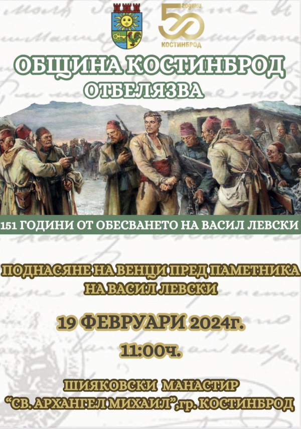 С поднасяне на венци пред паметника на Васил Левски в Шияковския манастир „Св. Архангел Михаил“, Община Костинброд ще почете паметта на Апостола. Отбелязването на 151-та годишнина от гибелта на Васил Левски ще започне в 11.00 ч. на 19 февруари.