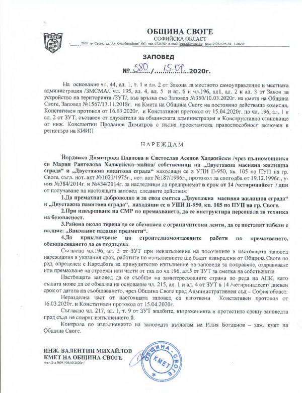 Община Своге издаде заповед (№580 / 15.04.2020г.) за премахване на двуетажна масивна жилищна сграда и двуетажна паянтова сграда, находящи се в УПИ II-950, кв. 105 по ПУП на гр. Своге. В срок от 14 дни от получаване на зповедта, наследниците трябва да премахнат "Двуетажна масивна жилищна сграда" и "Двуетажна паянтова сграда" доброволно и за своя сметка.