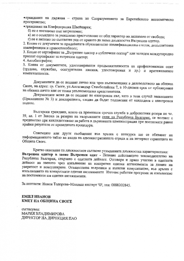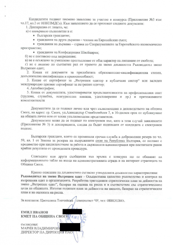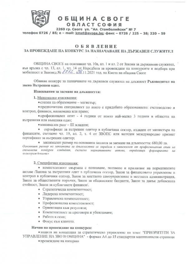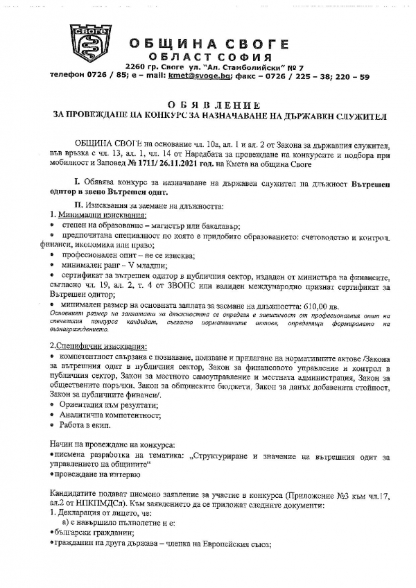 Oбщина Своге публикува на своята интернет страница обяви за провеждане на конкурс за длъжност „Вътрешен одитор в звено Вътрешен одит“ и „Ръководител на звено Вътрешен одитор“.