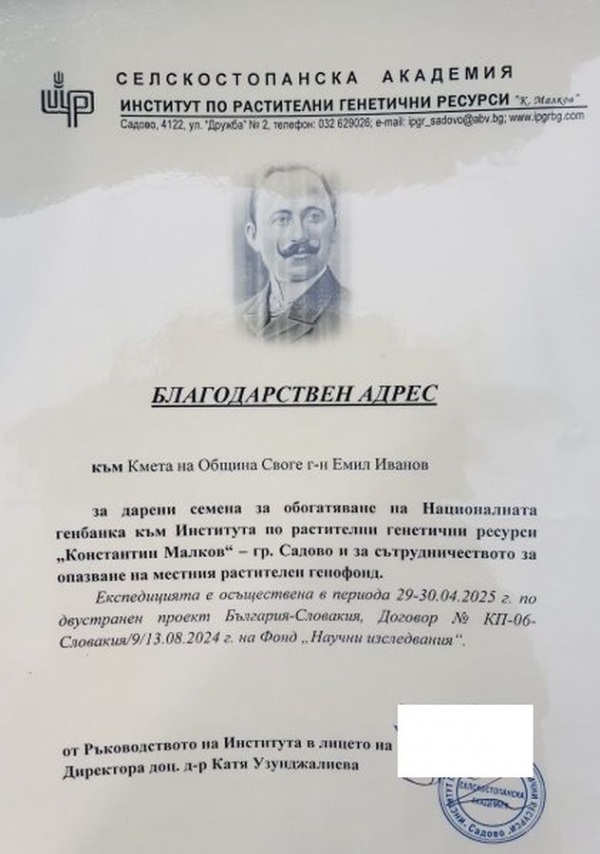 По време на събитието Емил Иванов – кмет на Община Своге, беше удостоен с благодарствен адрес от Института в Садово за приноса си към обогатяването на Националната генбанка чрез дарение на семена от местни сортове. Така се създават реални предпоставки за дългосрочното съхранение на генетичните ресурси, характерни за района на Своге и околните селища.