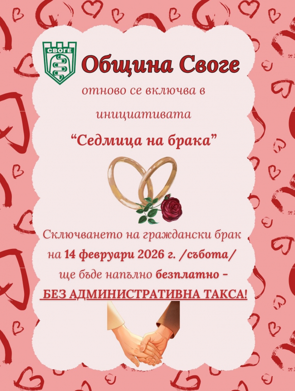 По повод инициативата „Седмица на брака“, която се отбелязва ежегодно в периода от 7 до 14 февруари с цел утвърждаване на ценностите на брака и семейството, Община Своге обяви специален жест към бъдещите младоженци.