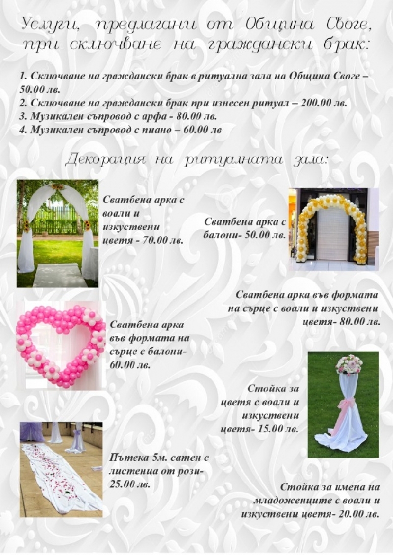 • Сключване на граждански брак в ритуална зала на Община Своге - 50 лв.