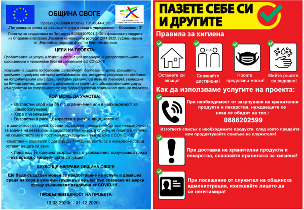 С реализацията на проектните дейности Община Своге ще подпомогне лицата в нужда в условията на разрасналата се пандемия от COVID-19. Ще бъде оказана  подкрепа на възрастни хора над 65 години с ограничения или невъзможност от самообслужване; лица с увреждания; възрастни в риск – лица, които са в зависимост от грижи, поради увреждане, неподвижност или невъзможност за водене на независим и самостоятелен живот; лица, поставени под карантина във връзка с COVID – 19; самотен/ни родител/и с дете/ца до 12 г., които са в невъзможност да оставят децата си сами. На лицата от целевите групи ще се извършва доставка на хранителни продукти и продукти от първа необходимост, лекарства /закупени със средства на потребителите/, заплащане на битови сметки, заявяване и получаване на неотложни административни услуги от жителите на всички населени места в община Своге.