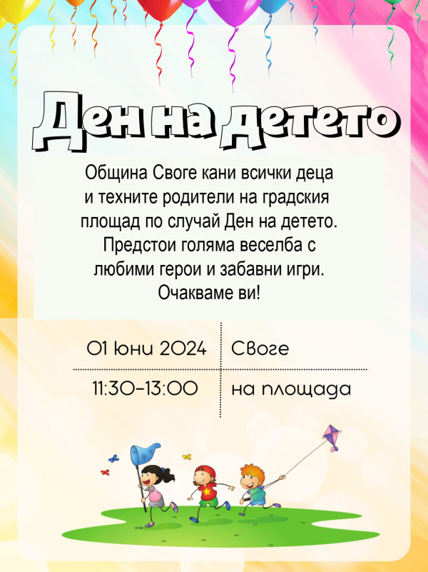 Празнично честване за Международния ден на детето – 1 юни организират от Община Свое. Много игри, забавления и изненади очакват малчуганите на централния площад в Своге, в празничния ден. Началният час на събитието е 11.30 ч.