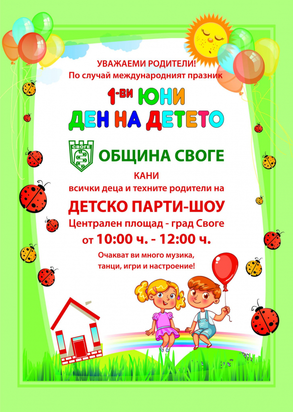 Пазнично честване организират от Община Свое за Международния ден на детето - 1 юни. Много игри, забавления и изненади очакват малчуганите на централния площад в Своге, в празничния ден. Началният час на събитието е 11:00 ч.