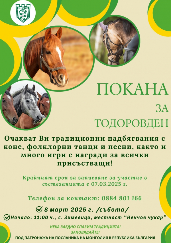 Община Своге традиционно ще отбележи Тодоровден с конни надбягвания и празнична програма. Тази година църквата почита паметта на Свети Теодор Тирон на 8 март. Началото на празника ще бъде точно в 11.00 часа в местността Ненчов чукар, село Зимевица.