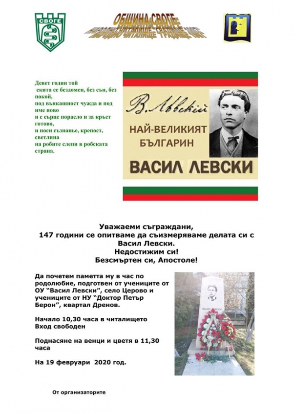 На 19 февруари 2020 г. се навършват 147 години от обесването на Апостола на българската свобода - Васил Левски. По този повод Община Своге и НЧ „Градище 1907“ ще почетат живота и делото на великия българин с "Час по родолюбие". Участие ще вземат учениците от общината, като часътпо родолюбие се състои в читалището и ще започне в 10:30 ч. на 19-ти февруари в читалището.