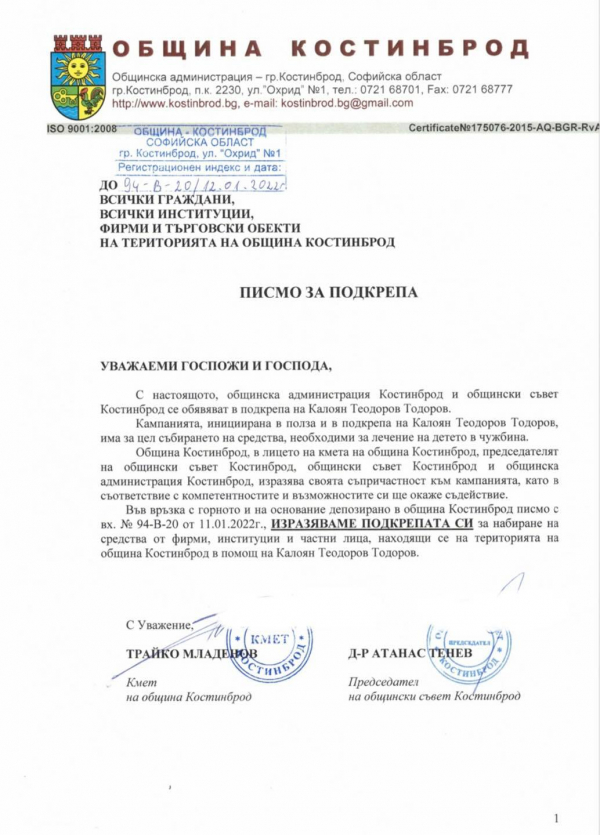 Общинска администрация - Костинброд и ОбС Костинброд се обявяват в подкрепа на Калоян Тодоров.