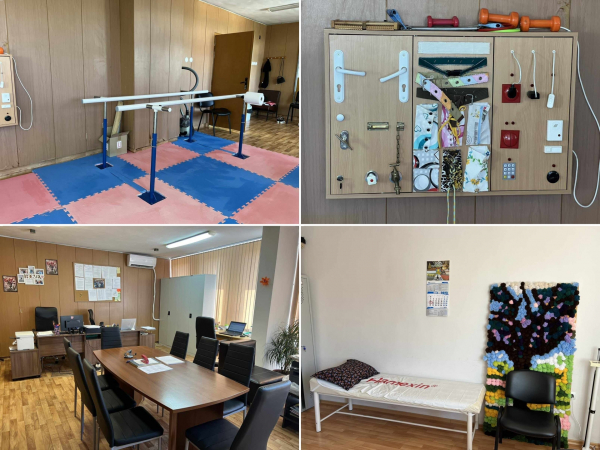 Зала за ЛФК разполага със шведска стена, огледала, постелки, масажна кушетка, табло на ДЕЖ, приспособления за суспенсионна и пулитерапия, тренировъчни уреди и приспособления - тояжки, гирички, топки, еспандери (уреди за трениране на фини движения, раздвижване на стави), помощни средства за позиционно лечение и за придвижване - опорна проходилка, табло за трениране на дейностите от ежедневието. Пътека, велоергометър, кростренажер, пейка за пилатес. TENS,  ултразвук, апарат за вакумна терапия. Вибрамасажор, медицинска топка. Настилката в залата е ударопоглъщаща (мека).