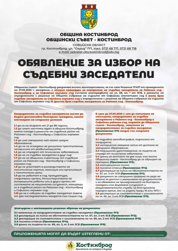 Общински съвет-Костинброд уведомява всички заинтересовани, че със свое Решение №437 от проведеното на 27.02.2025 г. заседание, е открил процедура за определяне на съдебни заседатели за Районен съд – Костинброд и за Софийски окръжен съд съгласно разпоредбите на чл.68, ал.1 от ЗСВ, в рамките на определените с решение на Общото събрание на съдиите от Софийски апелативен съд 5(пет) броя съдебни заседатели за Софийски окръжен съд и определените с решение на Общото събрание на съдиите от Софийски окръжен съд 10(десет) броя съдебни заседатели за Районен съд – Костинброд.