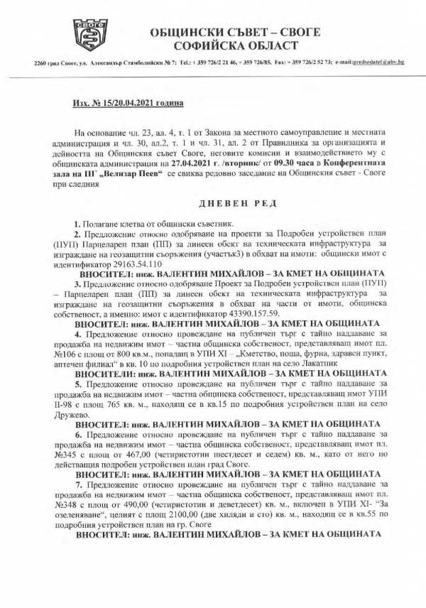 Редовното заседание ще проведе Общински съвет-Своге на 27.04.2021 г. /вторник/. То е насрочено с начален час 09:30 ч., в Конферентната зала на ПГ „Велизар Пеев“. Ето и Дневния ред: