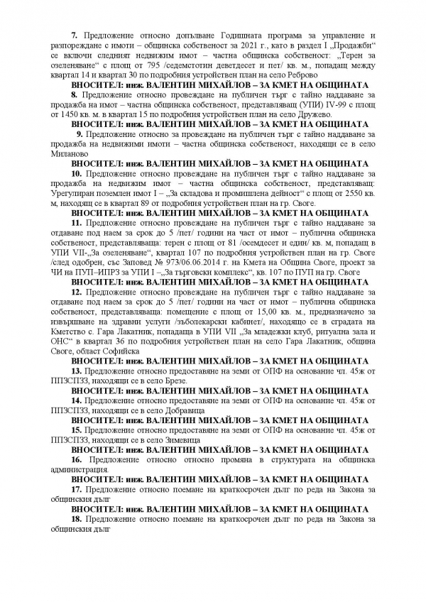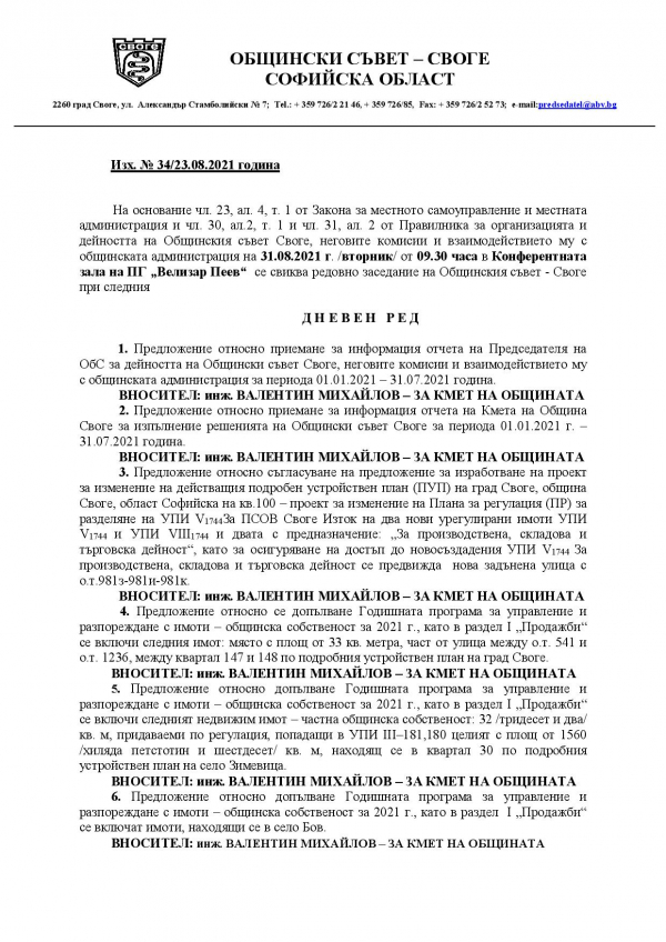 Сред точките, които ще бъдат разгледани на заседанието са: Предложение относно приемане за информация отчета на Председателя на ОбС за дейността на Общински съвет Своге, неговите комисии и взаимодействието му с общинската администрация за периода 01.01.2021 - 31.07.2021 г., Предложение относно приемане за информация отчета на Кмета на Община Своге за изпълнение решенията на Общински съвет Своге за периода 01.01.2021 г. - 31.07.2021 г., Предложения относно се допълване Годишната програма за управление и разпореждане с имоти - общинска собственост за 2021 г., Предложения относно предоставяне на земи от ОПФ на основание чл. 45ж от ППЗСПЗЗ и др.