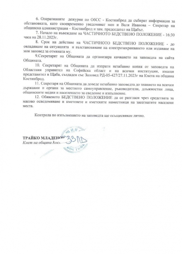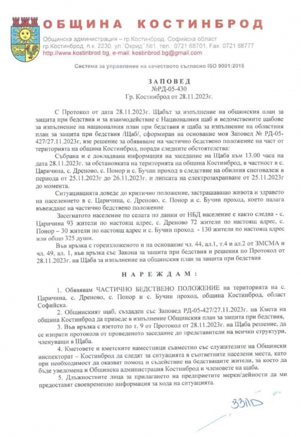 Във връзка с продължаването на липса на електрозахранване на селата Царичина, Понор, Дреново и Бучин проход, след взети решения от Щаба за изпълнение на общинския план за защита при бедствия, аварии и катастрофи със Заповед на кмета на община Костинброд се обявява частично бедствено положение в горепосочените населени места.
