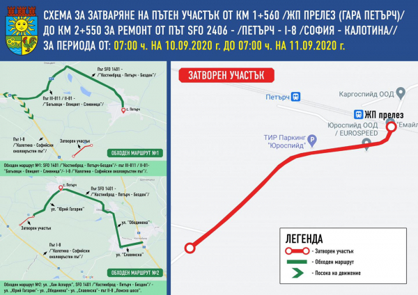 2. За времето от 07:00 ч. на 11.09.2020 г. /петък/ до 09:00 ч. на 12.09.2020 г. /събота/ включително да се преустанови движението на ППС по участък от км 0+000 до км 1+560 на път SFO2406/Драгоман-София/ /от края на населеното място до жп прелез на гара Петърч).