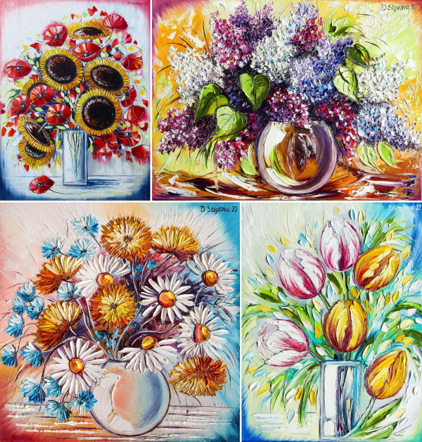 Чрез творбите си с маслени бои художничката Д. Стойкова се стреми да зареди хората с позитивна енергия, с ярки цветове и красиви форми. Картините са пъстроцветни, релефни и запомнящи се, създават пролетно настроение и усещането за топлина и хармония. Те се отличават с оригинален и разпознаваем от публиката стил. Всички картини от изложбата са ръчно рисувани чрез пастозна техника с наслояване на боите с шпакла върху платно, което ги прави силно релефни.