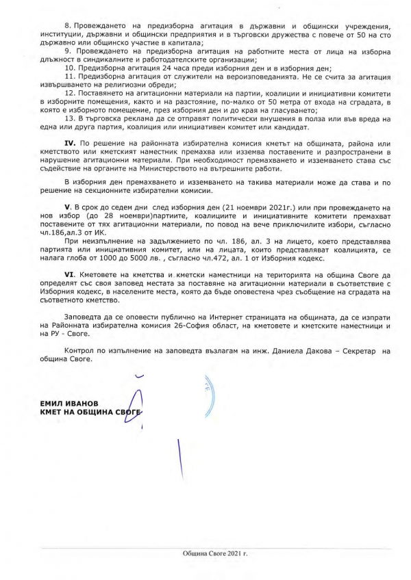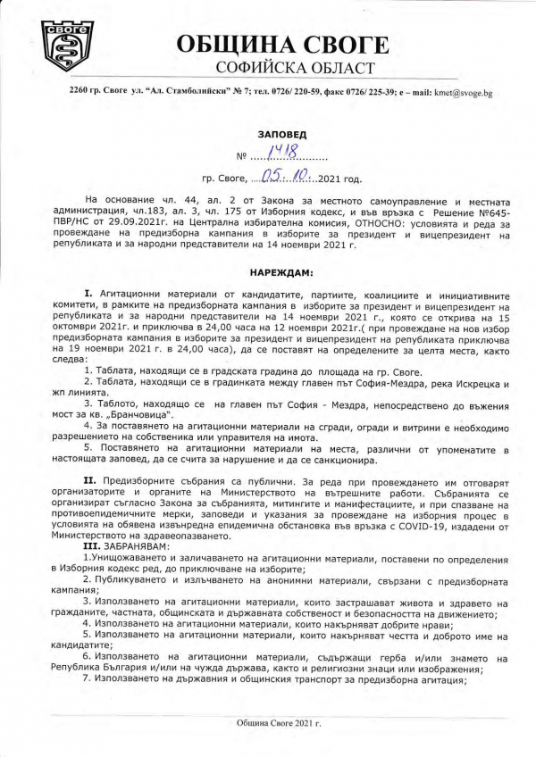 В община Своге продължава подготовката за провеждането на изборите за президент и вицепрезидент на Републиката и изборите за народни представители, на 14 ноември. Със заповед на кмета Емил Иванов, публикувана на сайта на Общината, са определени местата, на които могат да се поставят агитационни материали от кандидатите, партиите, коалициите и инициативните комитети в рамките на предизборната кампания.