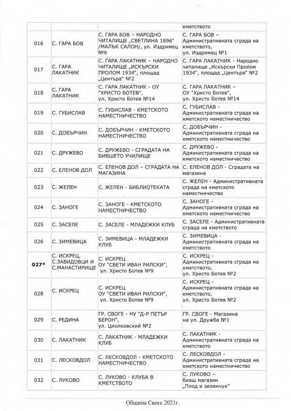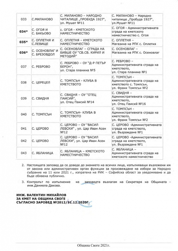 На основание чл.44, ал. 2 от Закона за местното самоуправление и местната администрация и чл.41, ал.1 и ал. 3 от Изборния кодекс във връзка с насрочените избори за Народно събрание на 11 юли 2021 г. и заповед на ЗА кмета на община Своге, на официалната интернет страница на Общината са публикувани определените места на обявяване на предварителните избирателните списъци във връзка с изборите за Народно събрание на 11 юли 2021 г.