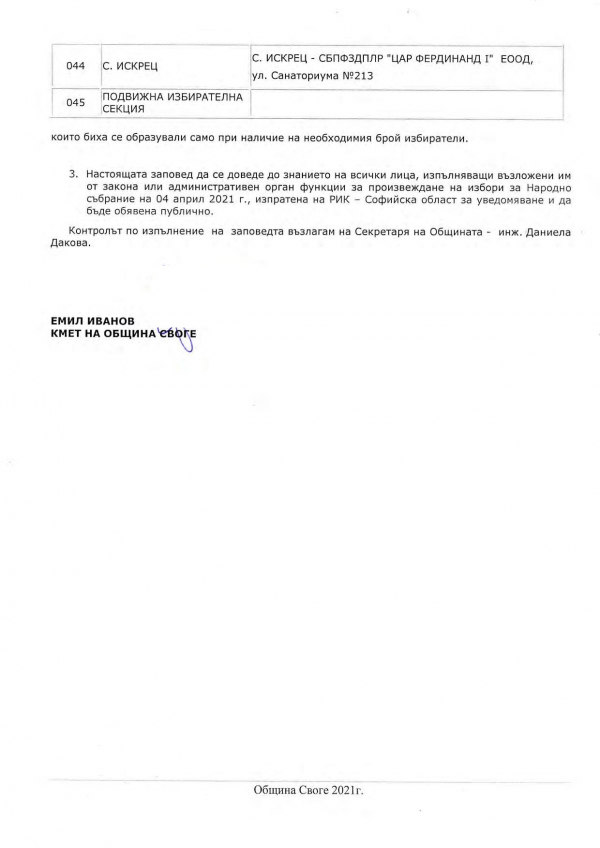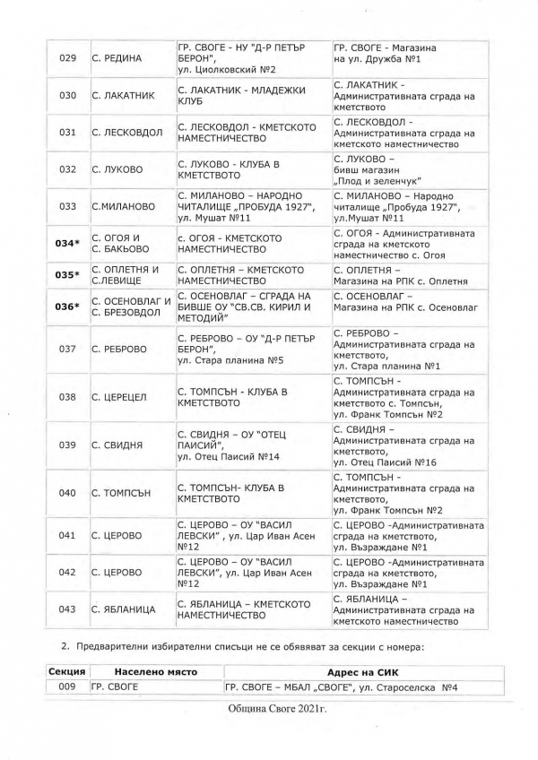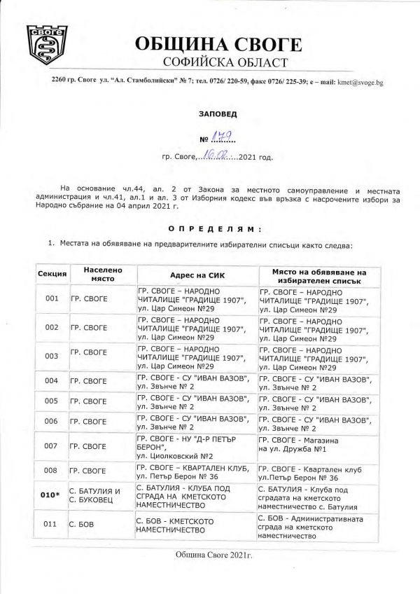 На основание чл.44, ал. 2 от Закона за местното самоуправление и местната администрация и чл.41, ал.1 и ал. 3 от Изборния кодекс във връзка с насрочените избори за Народно събрание на 04 април 2021 г. и заповед на кмета на община Своге, на официалната интернет страница на Общината са публикувани определените места на обявяване на предварителните избирателните списъци във връзка с изборите за Народно събрание на 04 април 2021 г.