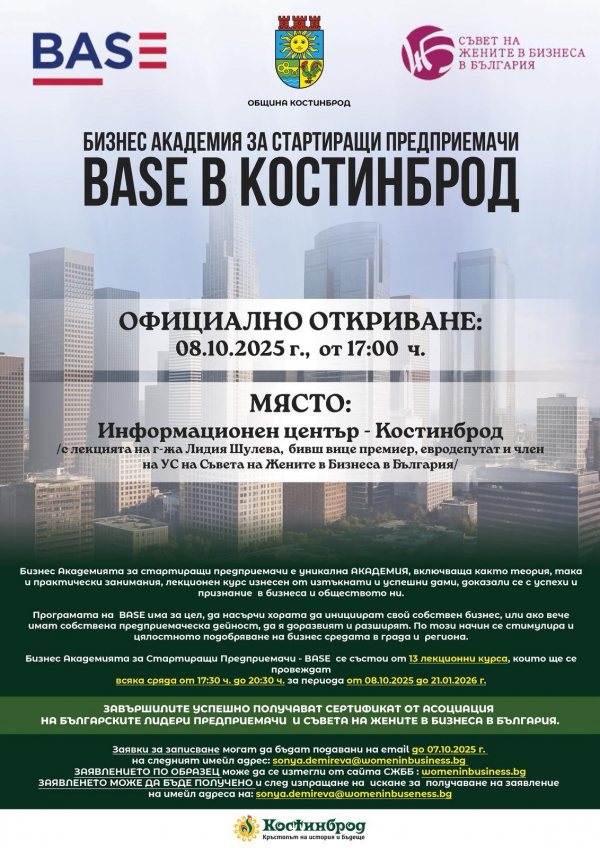 На 8 октомври 2025 г. стартира Бизнес академията за стартиращи предприемачи (BASE), иновативен и напълно безплатен курс за всички, които желаят да започнат или развият своя собствен бизнес. Проектът се реализира от Сдружение „Асоциация на Българските Лидери и Предприемачи“ и Сдружение „Съвет на жените в бизнеса в България“ с подкрепата на Община Костинброд.