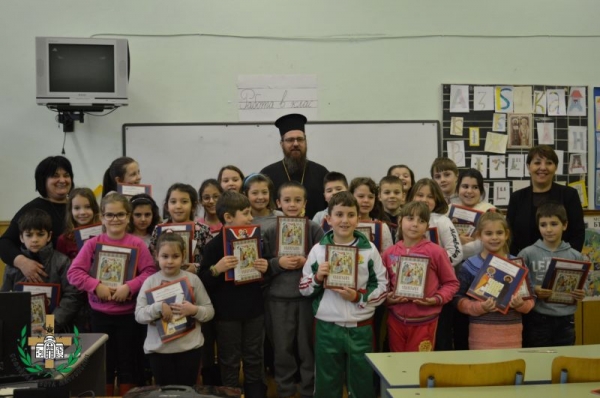 Епископ Поликарп бе посрещнат от директора  Евгения Анакиева и преподавателския състав, след което бе поканен в устроения кабинет по Религия, където го очакваха деца от втори клас, заедно със своята учителка Женя Методиева.