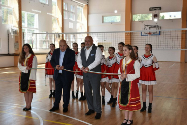 Инж. Валентин Михайлов и министър Кралев откриха ремонтирания физкултурен салон към СУ „Иван Вазов“ в Своге, като символично прерязаха лентов трибагреник.