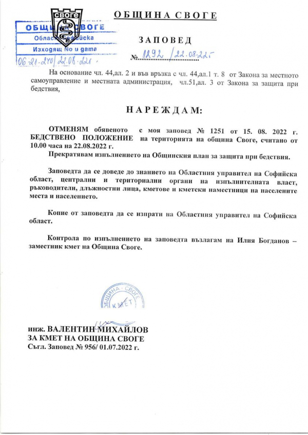 Със заповед, на ЗА Кмета на община Своге - инж. Валентин Михайлов, се отменя бедственото положение на територията на общината.