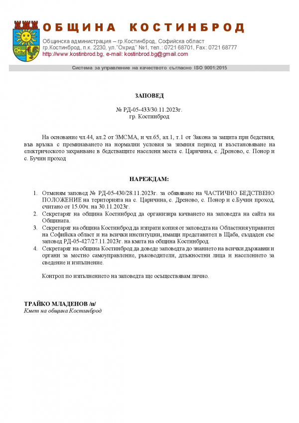 Община Костинброд отмени частичното бедствено положение на територията на с. Царичина, с. Дреново, с. Понор и с. Бучин проход, във връзка с преминаването на нормални условия за зимния период и възстановяване на електрическото захранване в бедстващите населени места.