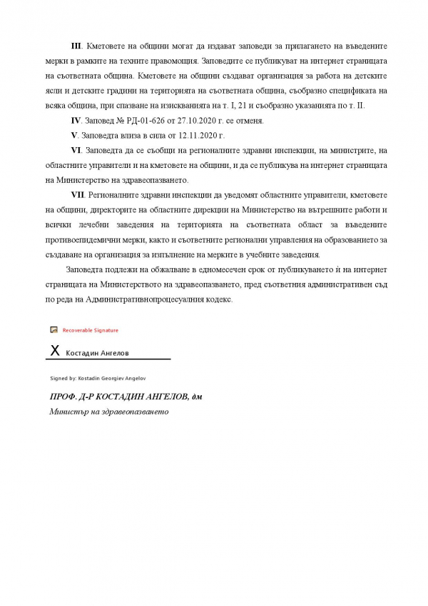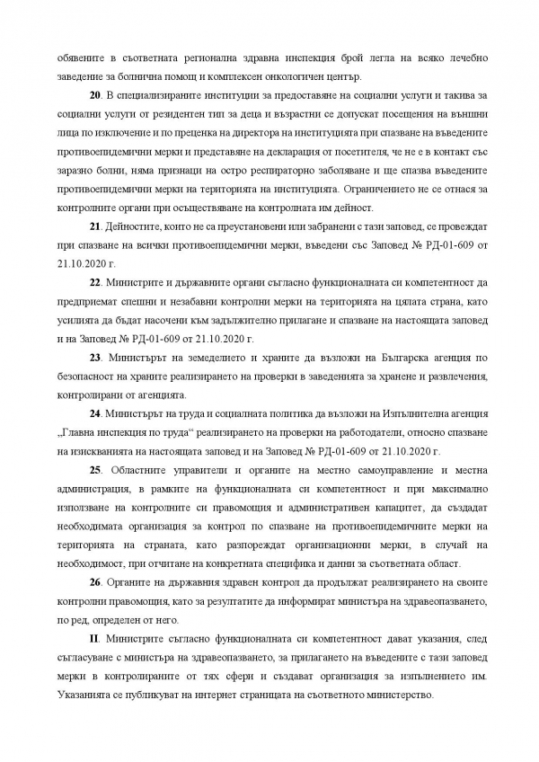 От 12 ноември до 30 ноември, с издадена Заповед № РД-01-651/11.11.2020 г. здравният министър въвежда следните противоепидемични мерки на територията на Р България: