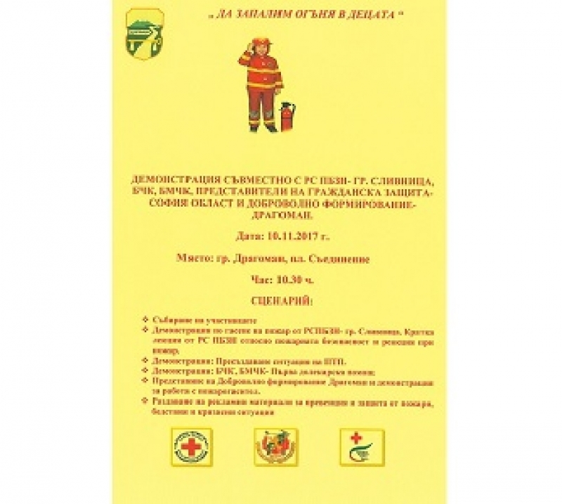 Зрелищна демонстрация организират за децата на Драгоман от общинското ръководство, съвместно с на РС ПБЗН-Сливница, БЧК, БМЧК, представители на Гражданска защита-София област и Доброволно формирование-Драгоман.