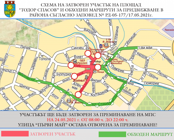 Със Заповед номер РД-05-177 от 17.05.2021г. за времето от 08:00 до 22:00 часа на 24.05.2021г. се преустановява движението на МПС-та през площад „Тодор Спасов“, Първи район на град Костинброд, във връзка с планирано провеждане на традиционен събор в град Костинброд. На територията на площада се допуска преминаване единствено на автомобили със специален режим на придвижване и служебни автомобили на Общинската администрация.