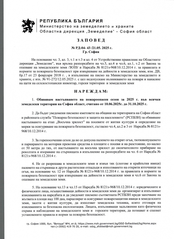 Със заповед № РД-04-43 от 21.05.2025 г., директорът на Областна дирекция „Земеделие“ – София област, Петко Николаев Димов, официално обяви началото на пожароопасния сезон за територията на областта. Сезонът ще продължи от 10 юни до 31 октомври 2025 г.