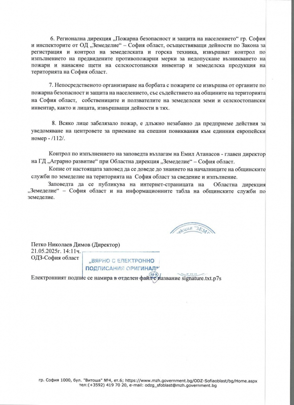 Гражданите се приканват при забелязване на пожар или риск от такъв незабавно да сигнализират на тел. 112. Контролът по изпълнение на заповедта е възложен на Емил Атанасов, главен директор на Главна дирекция „Аграрно развитие“.