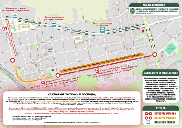 - От 08:00 ч. на 03.04.2025 г. до 17:00 ч. на 05.04.2025 г. се преустановява обслужването на спирките „Училището“, „Гарата“ и „Лимонадената“ в Костинброд.