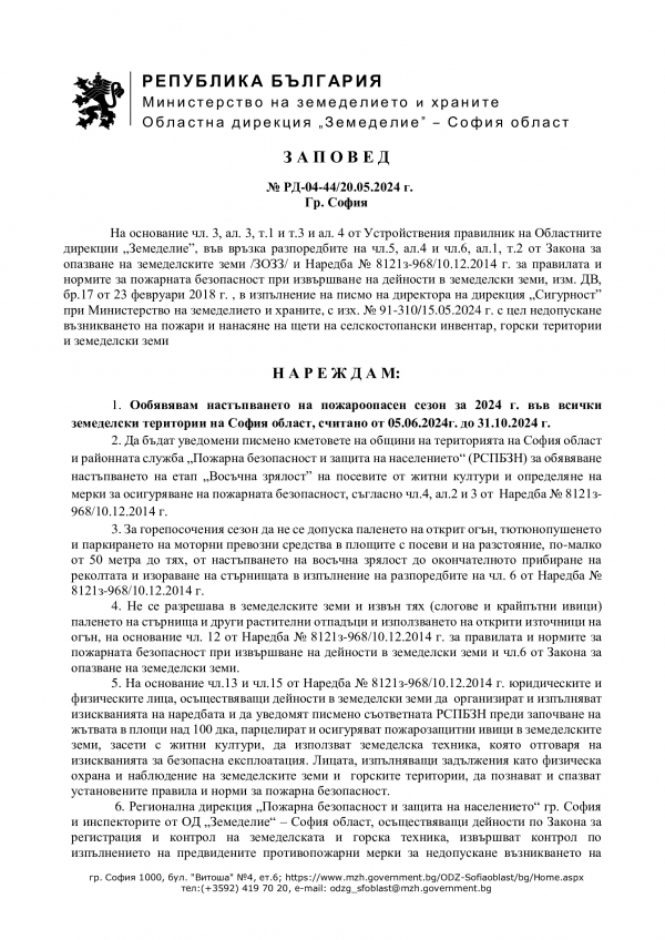 Считано от 05.06.2024 г. до 31.10.2024 г., Областна дирекция „Земеделие“ – София област обявява настъпването на пожароопасен сезон за 2024 г. във всички земеделски територии в София област.