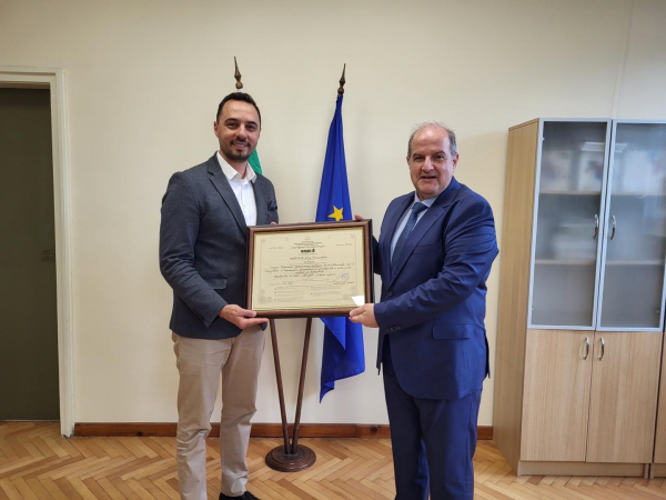 Изпълнителният директор на БАИ – Богдан Богданов връчи сертификата на Емануил Скарамагас – изпълнителен директор на Интерион АД /Завод за производство на течен шоколад Nucrema в гр. Костинброд/.